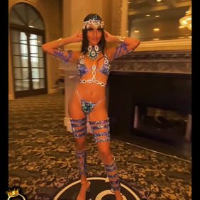 Includes: Tiara or Large Headpiece Necklace with Decorated Shoulders Leg Pieces Thigh Bands Wrist Bands Decorated Panty or Belt Option 1 or 2 Bra or Wirebra Feathered Goddess Backpack